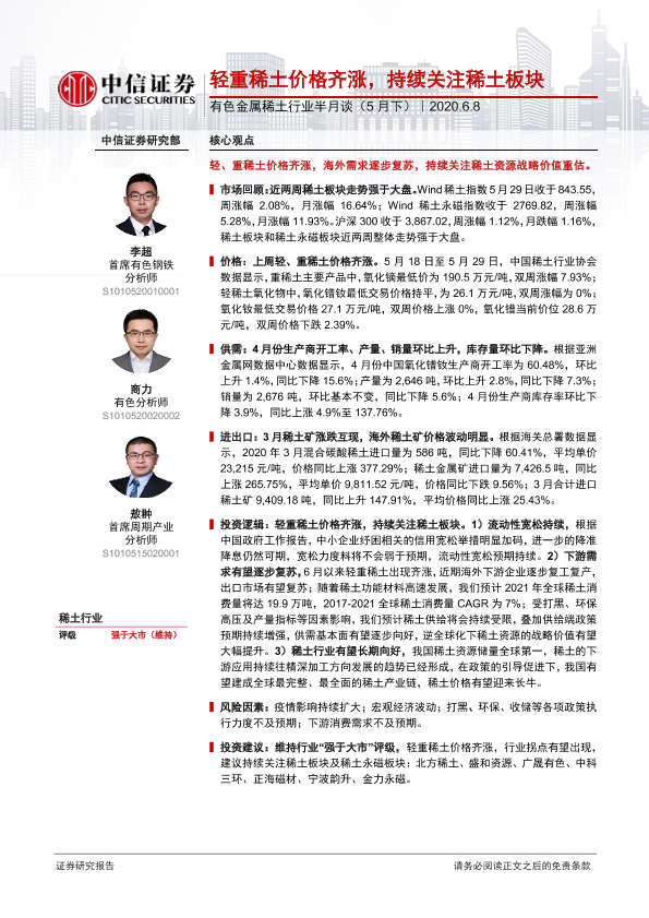 【中信证券】【20200608】有色金属稀土行业半月谈(5月下):轻重稀土价格齐涨,持续关注稀土板块-32页