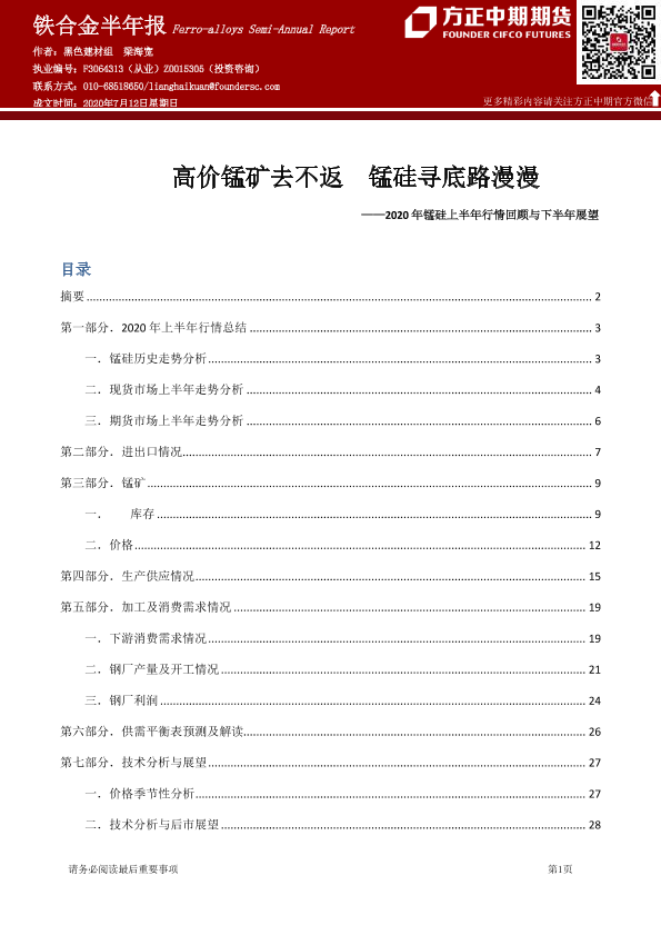 【方正中期期货】【20200712】2020年锰硅上半年行情回顾与下半年展望:高价锰矿去不返,锰硅寻底路漫漫-30页