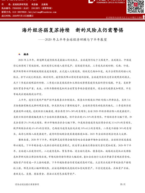 【方正中期期货】【20200712】2020年上半年全球经济回顾与下半年展望:海外经济弱复苏持续,新的风险点仍需警惕-63页