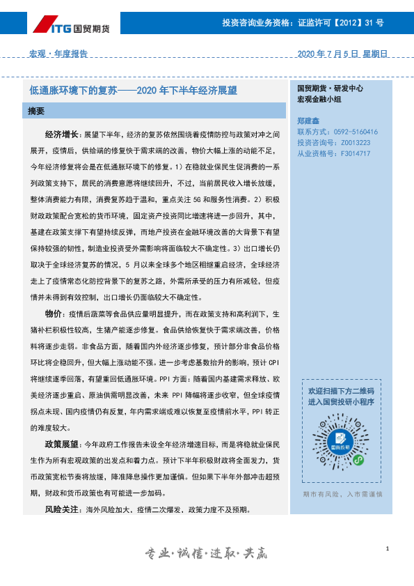 【国贸期货】【20200705】2020年下半年经济展望:低通胀环境下的复苏-20页