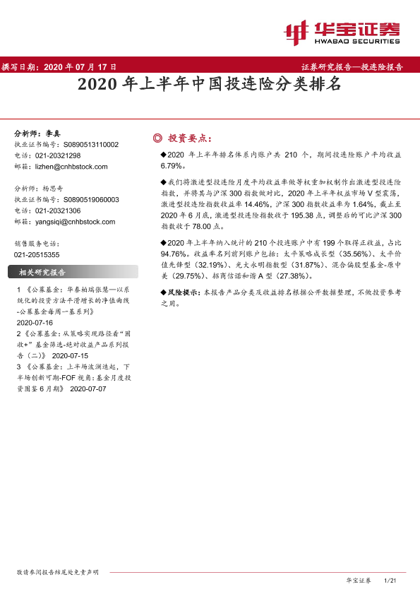 【华宝证券】【20200717】2020年上半年中国投连险分类排名-21页