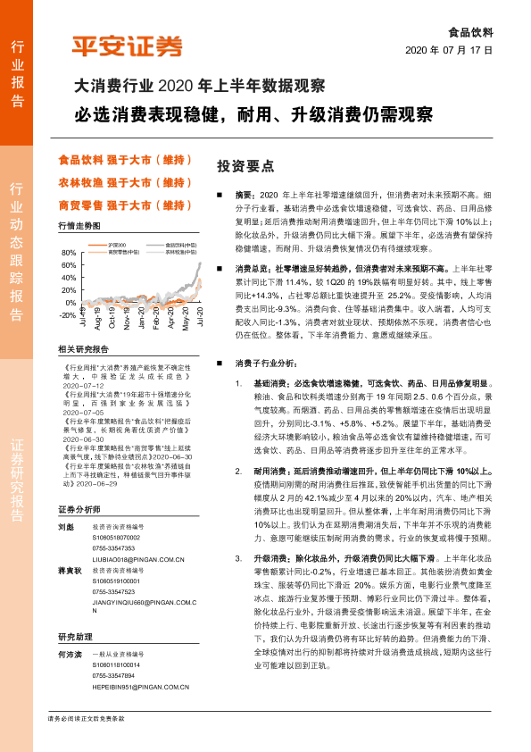 【平安证券】【20200717】大消费行业2020年上半年数据观察:必选消费表现稳健,耐用、升级消费仍需观察-14页