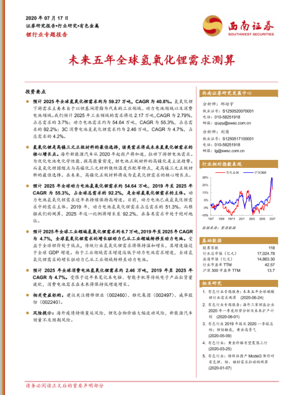 【西南证券】【202007】锂行业专题报告:未来五年全球氢氧化锂需求测算-15页