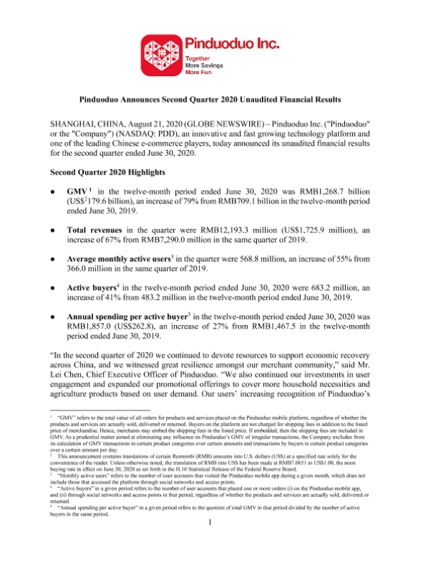 【拼多多(Pinduoduo Inc.)】【20200821】拼多多2020年第二季度未经审计的财务结果-13页