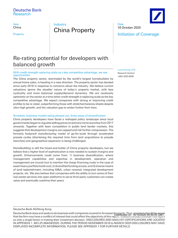 【Deutsche Bank Research】【20201016】中国房地产:重新评估平衡增长的开发商潜力-90页