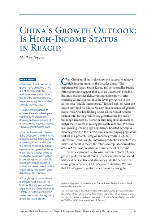 【Federal Reserve Bank of New York】【202010】中国的经济增长前景:正在列入高收入国家?-30页