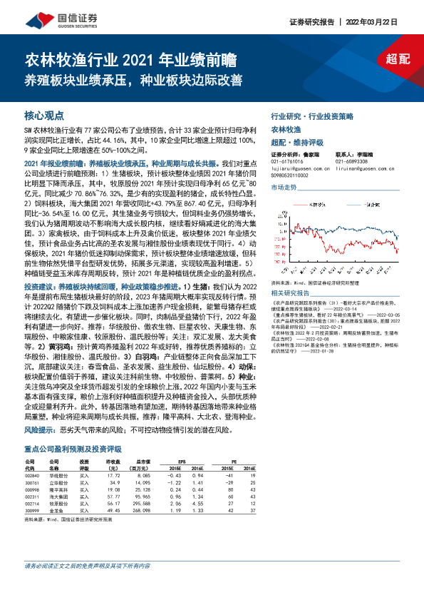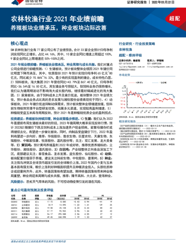 【国信证券】【20220322】农林牧渔行业2021年业绩前瞻:养殖板块业绩承压,种业板块边际改善-15页