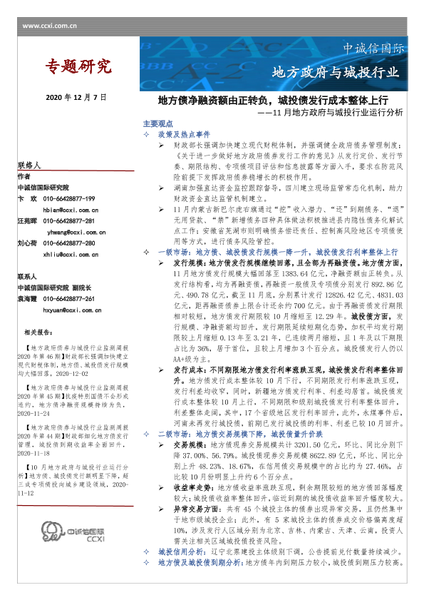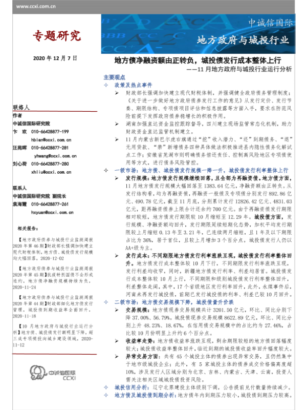【中诚信国际】【202012】11月地方政府与城投行业运行分析-10页