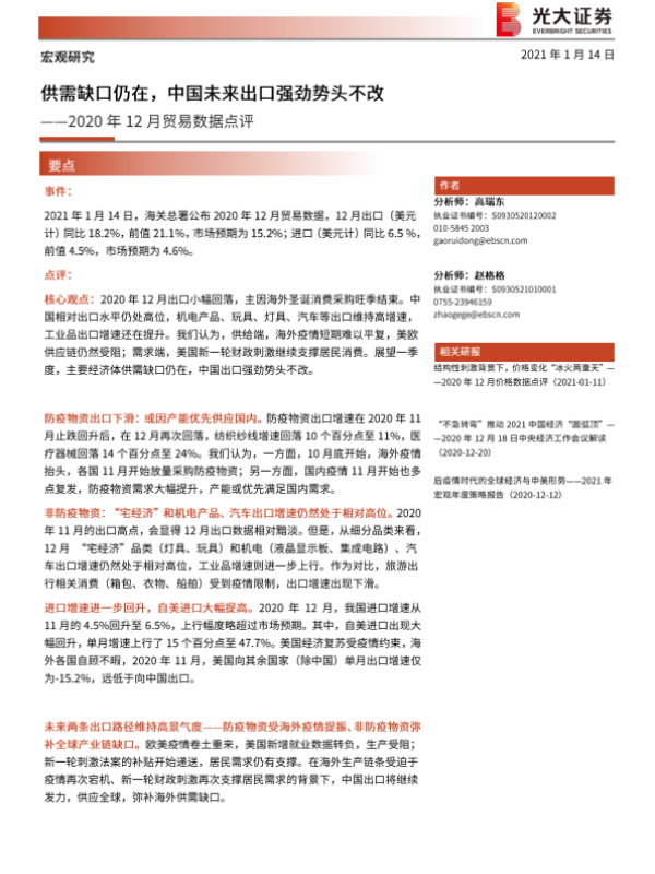 【光大证券】【20210114】2020年12月贸易数据点评:供需缺口仍在,中国未来出口强劲势头不改-10页