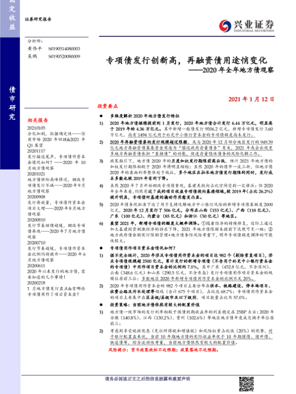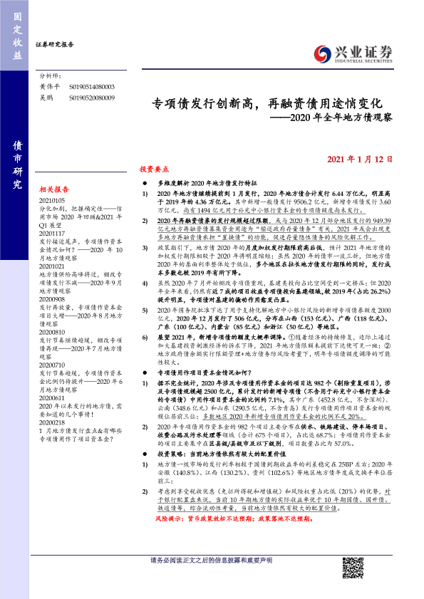 【兴业证券】【20210112】2020年全年地方债观察:专项债发行创新高,再融资债用途悄变化-15页