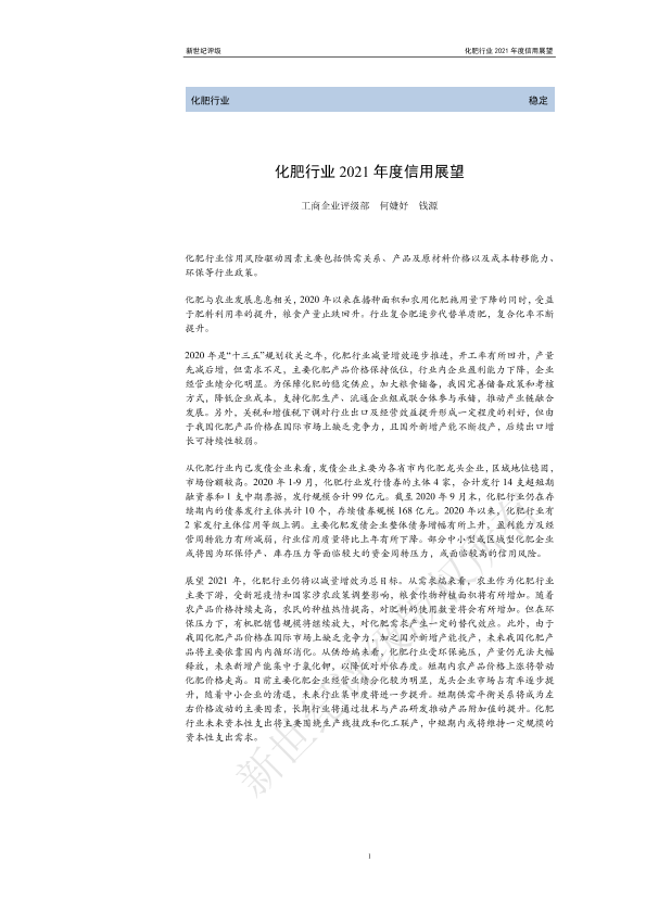 【新世纪评级】【202101】化肥行业2021年度信用展望-22页