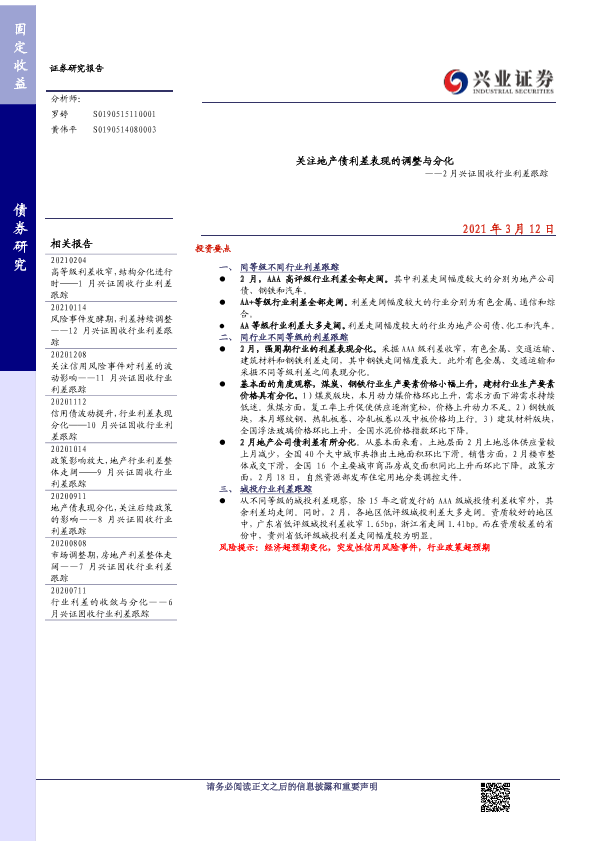 【兴业证券】【20210312】2月兴证固收行业利差跟踪:关注地产债利差表现的调整与分化-11页