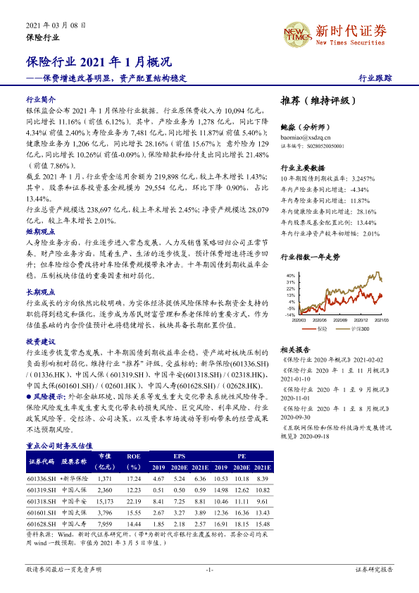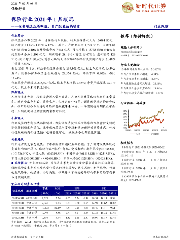 【新时代证券】【20210308】保险行业2021年1月概况:保费增速改善明显,资产配置结构稳定-13页