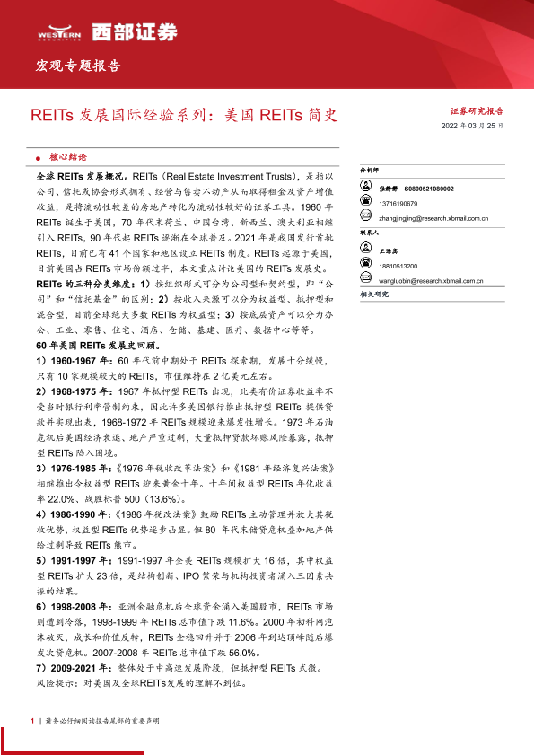 【西部证券】【20220325】宏观专题报告:REITs发展国际经验系列,美国REITS简史-18页