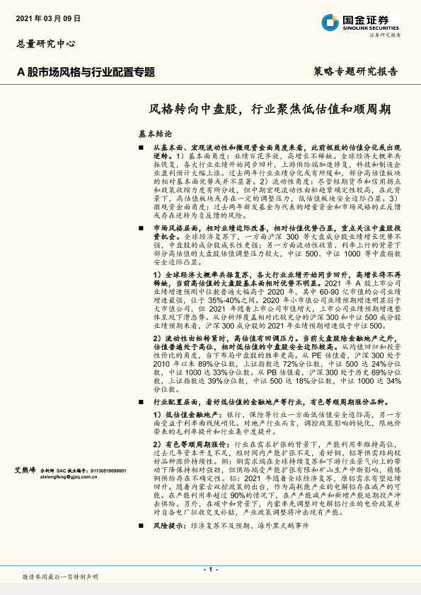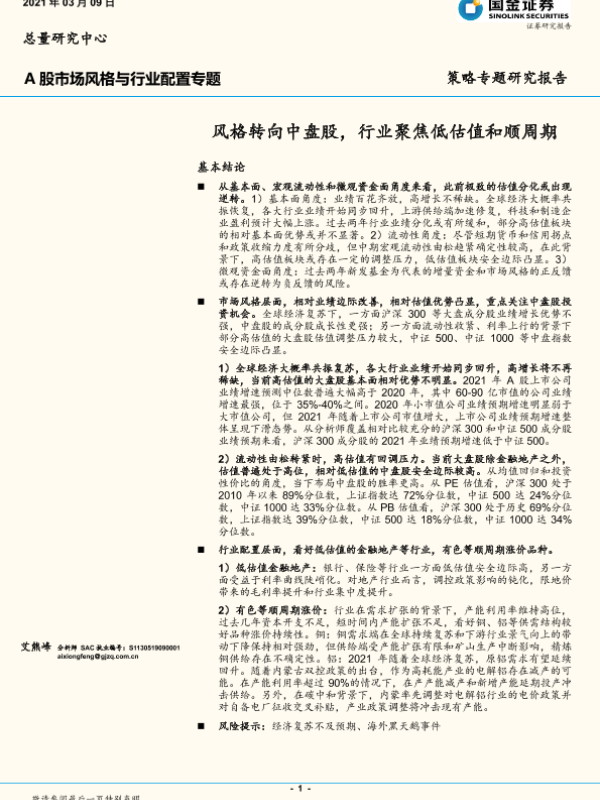 【国金证券】【20210309】A股市场风格与行业配置专题:风格转向中盘股,行业聚焦低估值和顺周期-12页