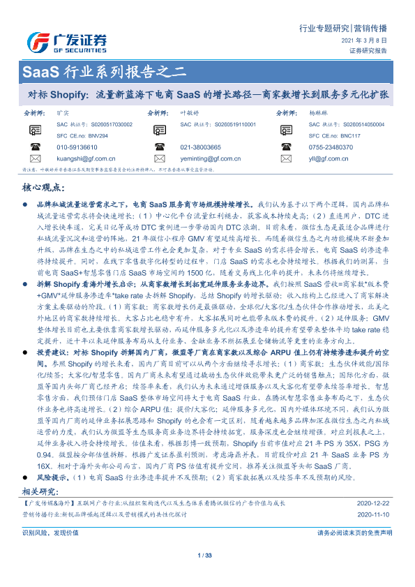 【广发证券】【20210308】SaaS行业系列报告之二:对标Shopify,流量新蓝海下电商SaaS的增长路径,商家数增长到服务多元化扩张-33页