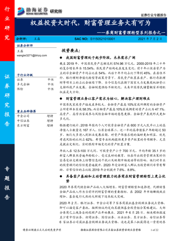 【渤海证券】【20210702】券商财富管理转型系列报告之一:权益投资大时代,财富管理业务大有可为-22页