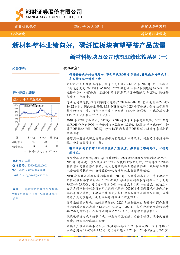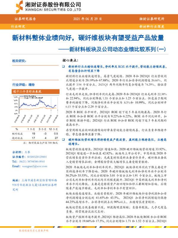 【湘财证券】【20210629】新材料板块及公司动态业绩比较系列(一):新材料整体业绩向好,碳纤维板块有望受益产品放量-25页