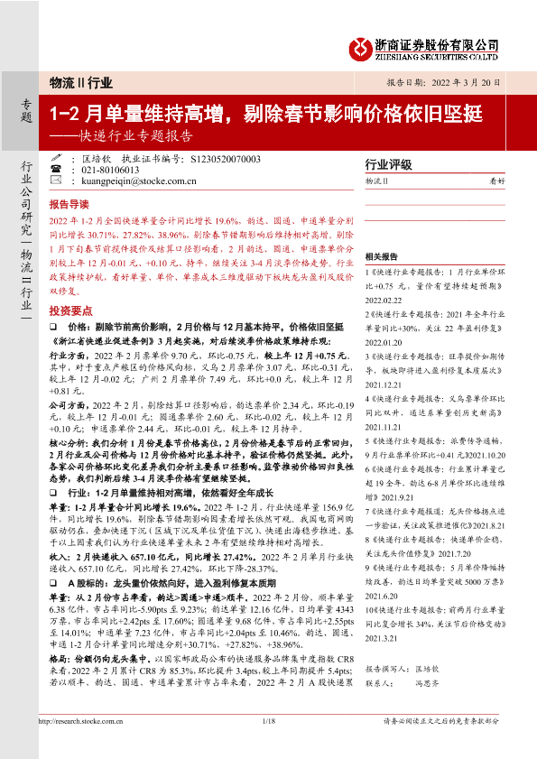 【浙商证券】【20220320】快递行业专题报告:1_2月单量维持高增,剔除春节影响价格依旧坚挺-18页