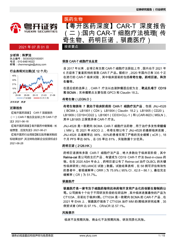【粤开证券】【20210701】CAR-T深度报告(二):国内CAR-T细胞疗法梳理-15页