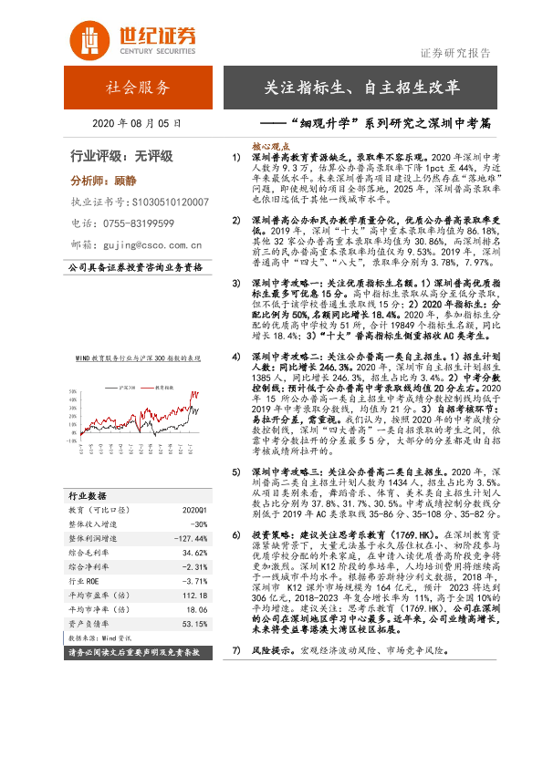 【世纪证券】【20200805】“细观升学”系列研究之深圳中考篇:关注指标生、自主招生改革-32页
