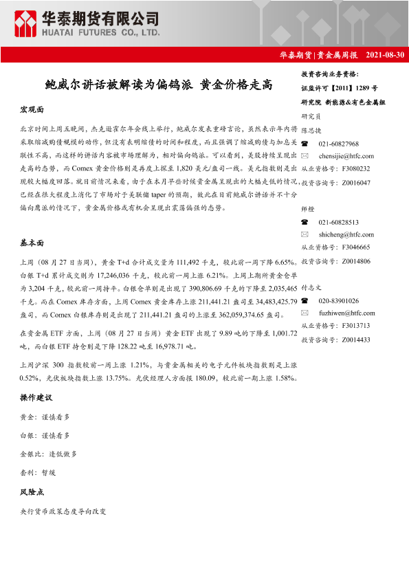 【华泰期货】【20210830】20210830-华泰期货-贵金属周报_鲍威尔讲话被解读为偏鸽派_黄金价格走高-10页