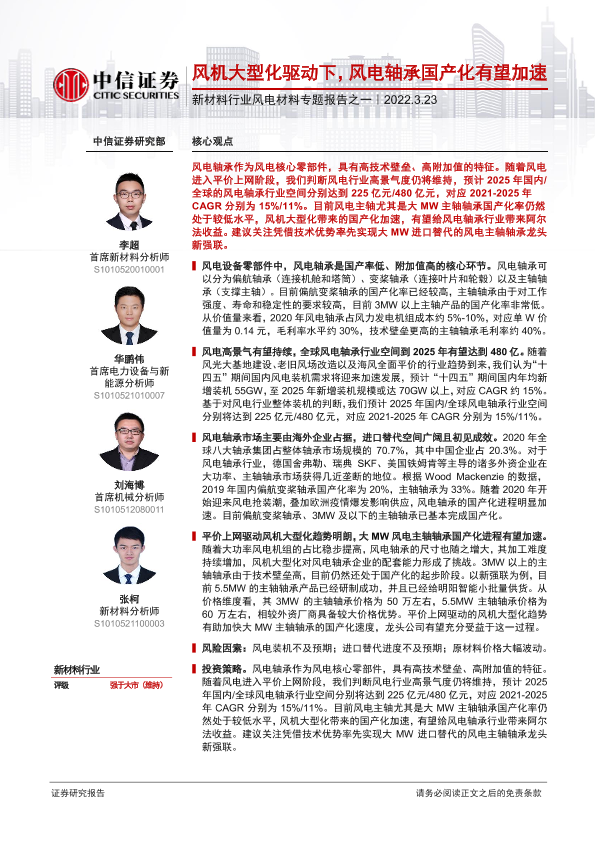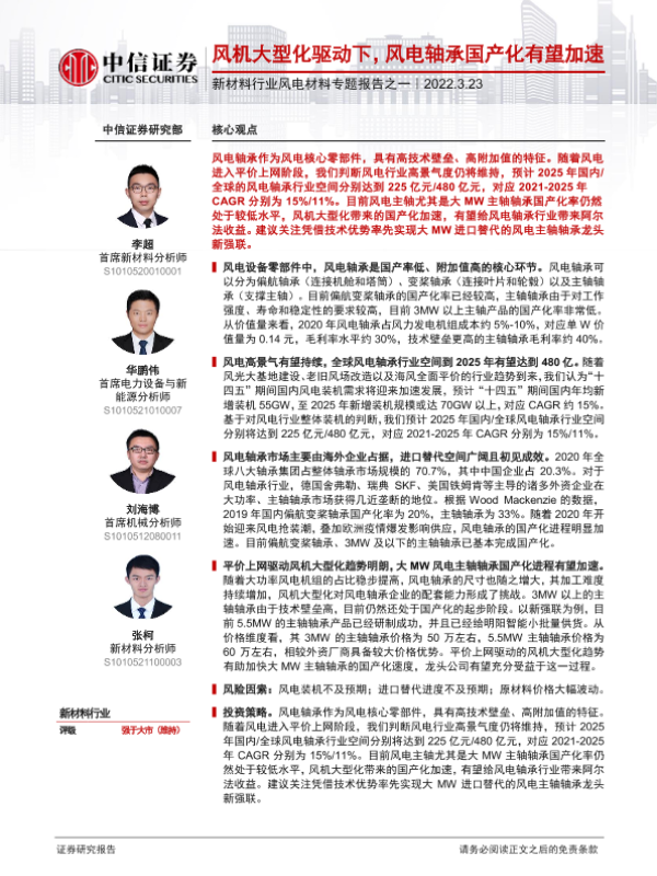 【中信证券】【20220323】新材料行业风电材料专题报告之一:风机大型化驱动下,风电轴承国产化有望加速-26页