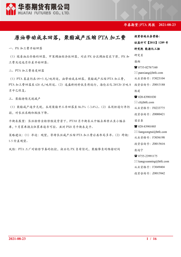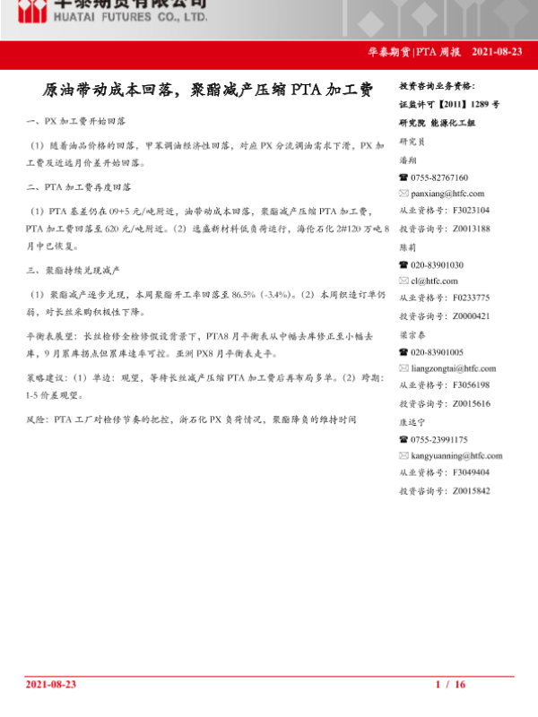 【华泰期货】【20210823】PTA周报_原油带动成本回落_聚酯减产压缩PTA加工费-16页