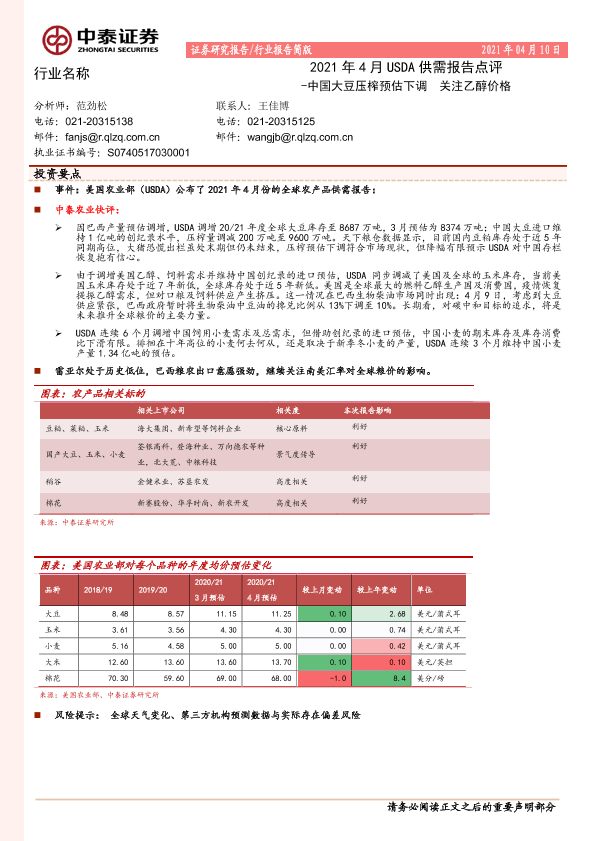 【中泰证券】【20210410】农业2021年4月USDA供需报告点评:中国大豆压榨预估下调 关注乙醇价格-10页