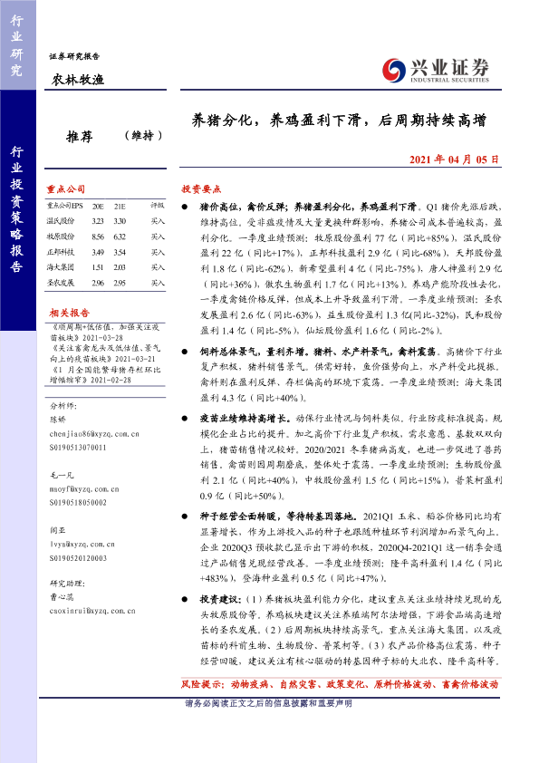 【兴业证券】【20210405】20210405-兴业证券-农林牧渔行业投资策略报告:养猪分化,养鸡盈利下滑,后周期持续高增-12页
