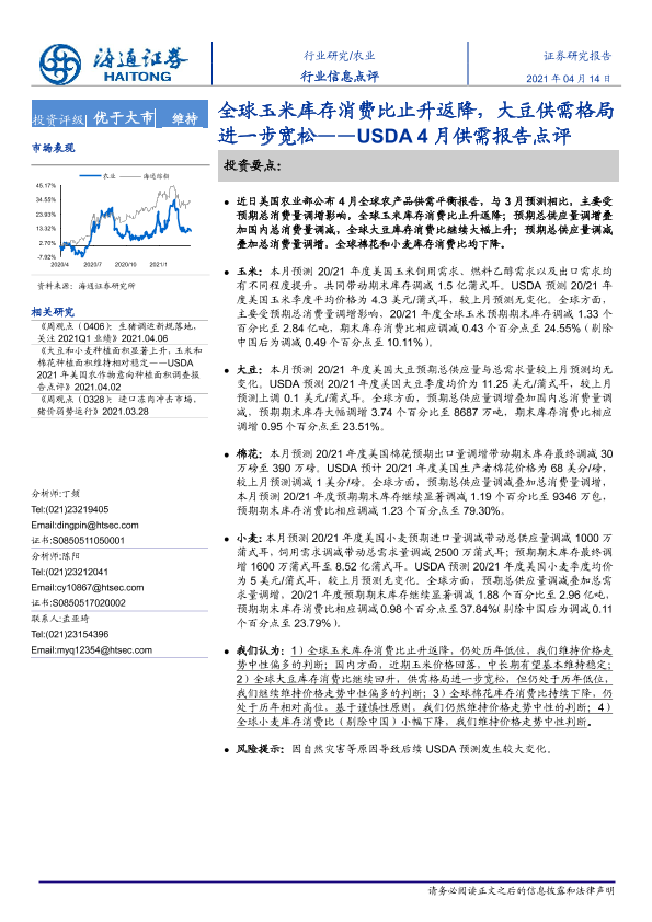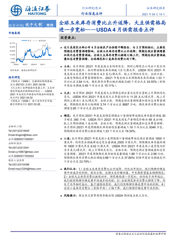 【海通证券】【20210414】农业行业USDA4月供需报告点评:全球玉米库存消费比止升返降,大豆供需格局进一步宽松-6页