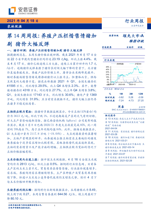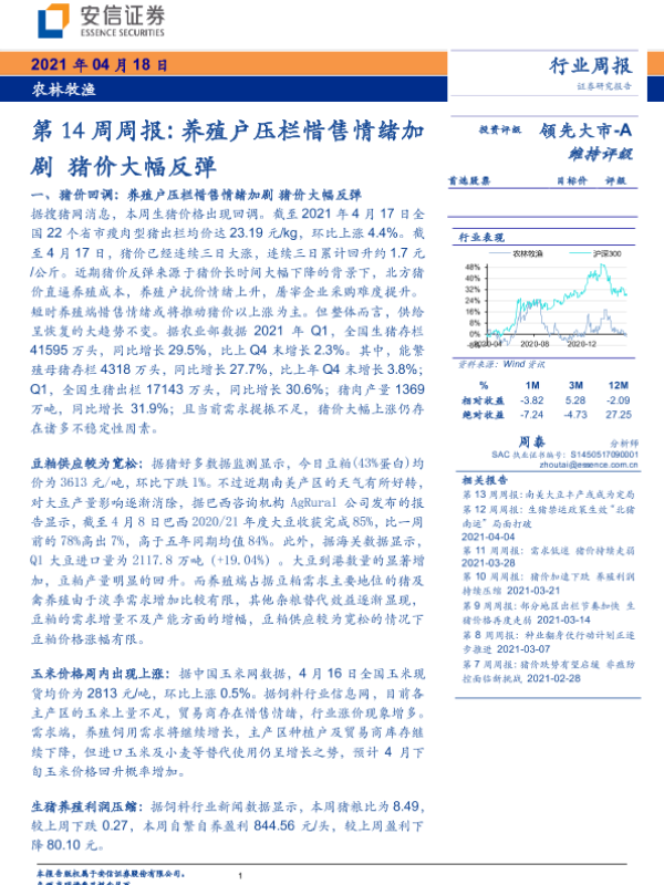【安信证券】【20210418】农林牧渔第14周周报:养殖户压栏惜售情绪加剧 猪价大幅反弹-19页