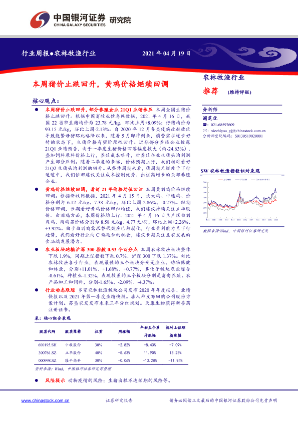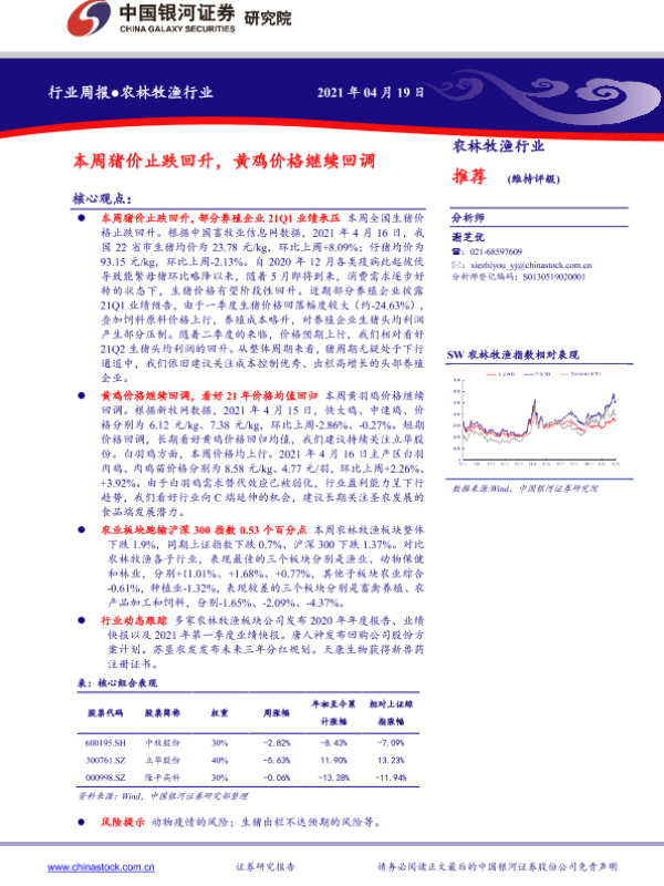 【银河证券】【20210419】20210419-中国银河-农林牧渔行业:本周猪价止跌回升,黄鸡价格继续回调-22页