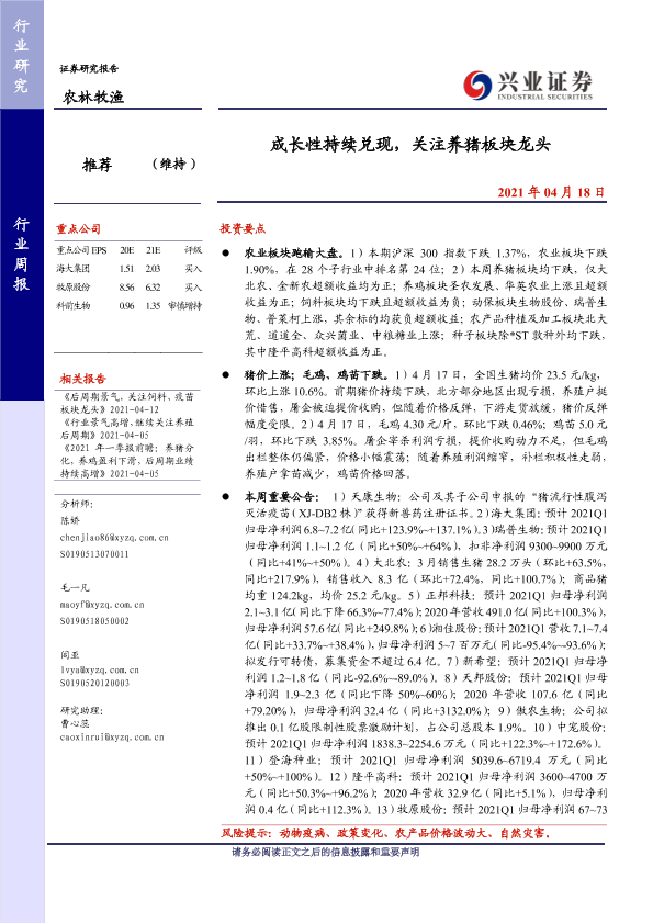 【兴业证券】【20210418】20210418-兴业证券-农林牧渔行业周报:成长性持续兑现,关注养猪板块龙头-15页