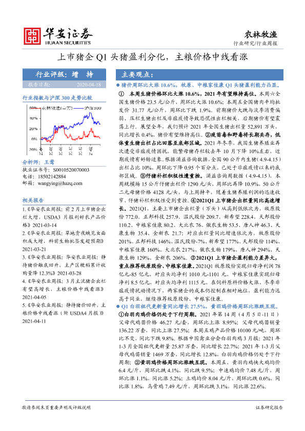 【华安证券】【20210418】20210418-华安证券-农林牧渔行业周报:上市猪企Q1头猪盈利分化,主粮价格中线看涨-40页