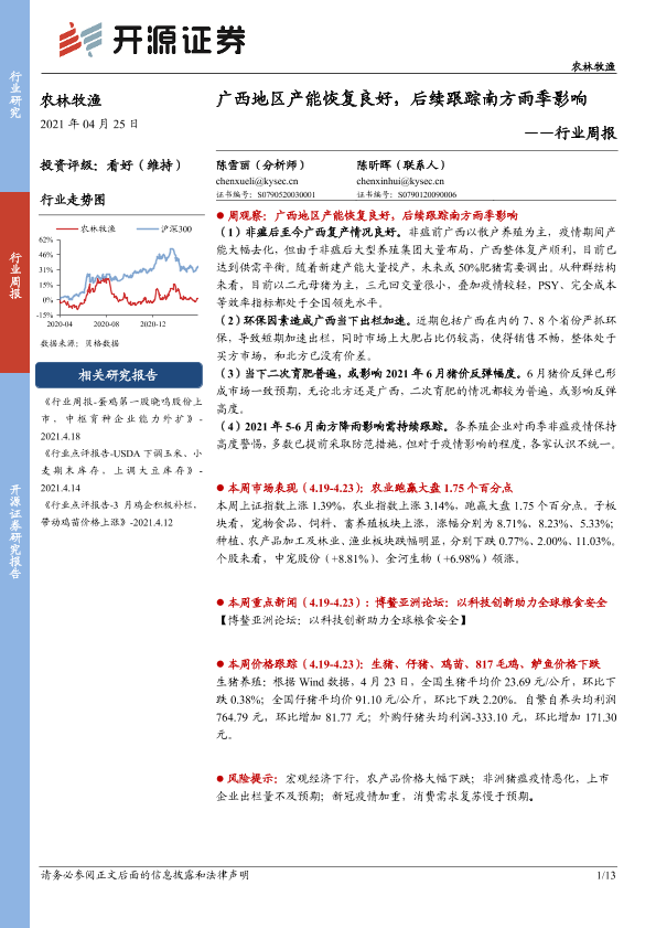 【开源证券】【20210425】农林牧渔行业周报:广西地区产能恢复良好,后续跟踪南方雨季影响-13页