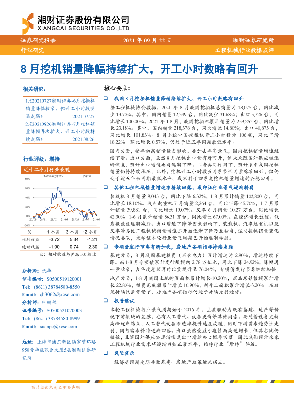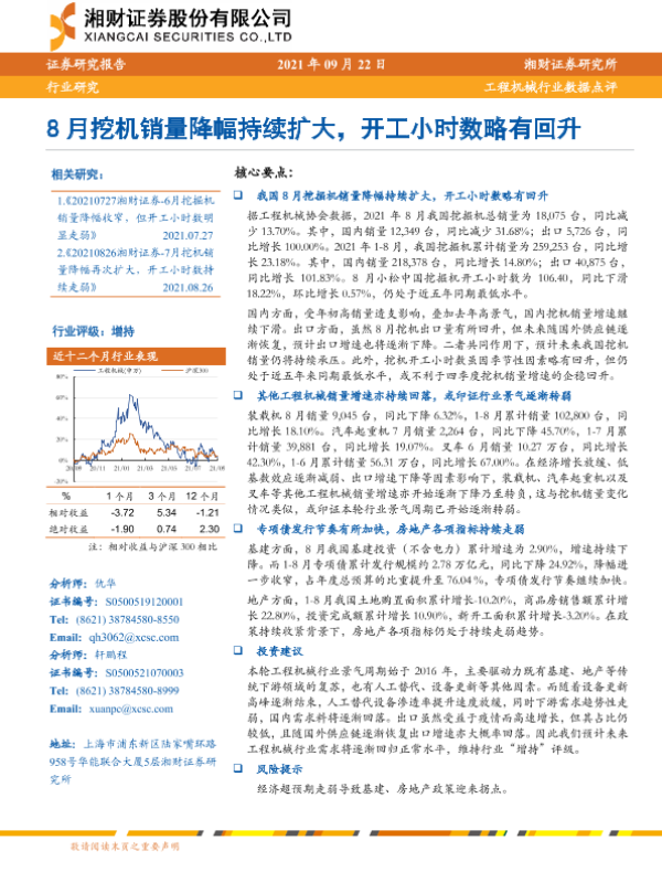 【湘财证券】【20210922】20210922-湘财证券-工程机械行业数据点评:8月挖机销量降幅持续扩大,开工小时数略有回升-6页