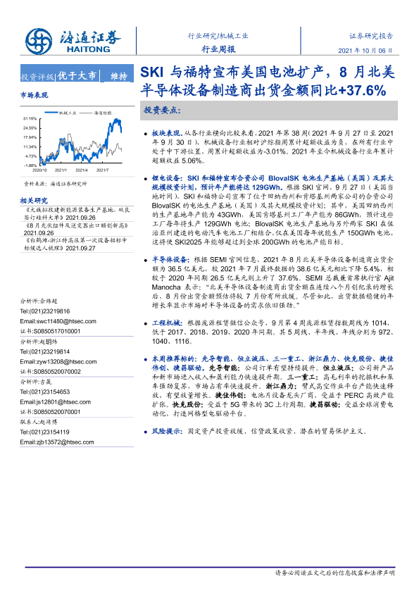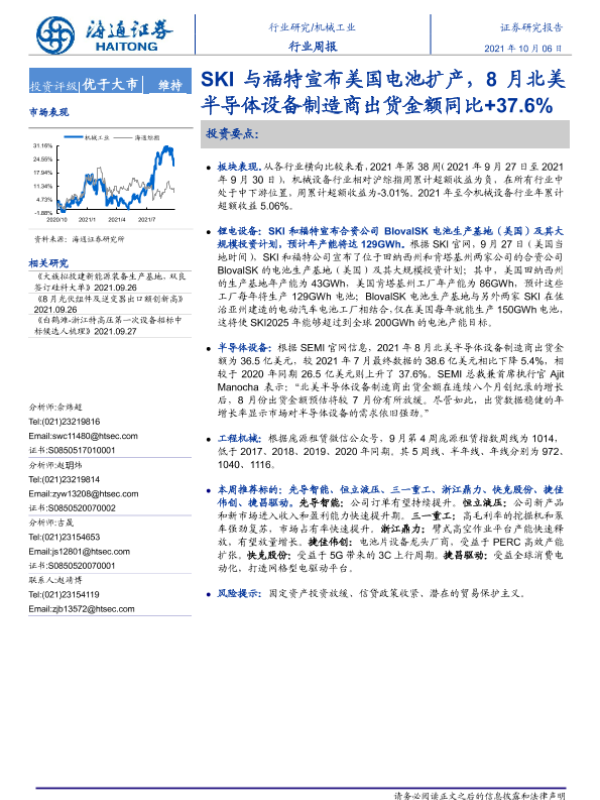 【海通证券】【20211006】20211006-海通证券-机械工业行业周报:SKI与福特宣布美国电池扩产,8月北美半导体设备制造商出货金额同比+37.6%-9页