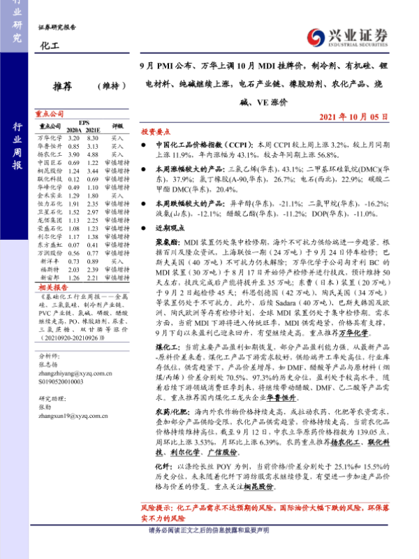 【兴业证券】【20211005】9月 PMI公布、万华上调 10月 MDI挂牌价,制冷剂、有机硅、锂电材料、纯碱继续上涨,电石产业链、橡胶助剂、农化产品、烧碱、VE涨价-44页