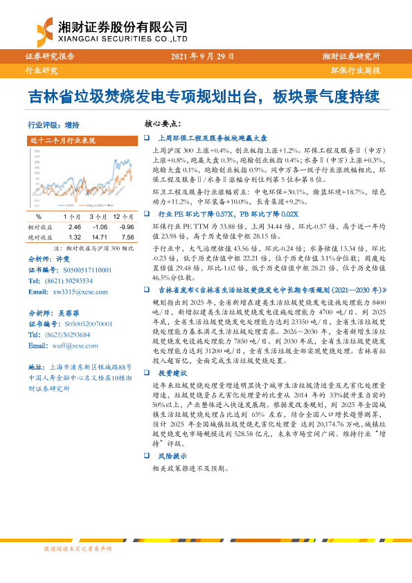 【湘财证券】【20210929】环保行业周报:吉林省垃圾焚烧发电专项规划出台,板块景气度持续-7页