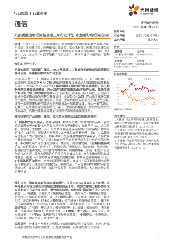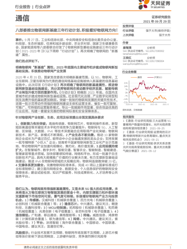 【天风证券】【20210929】八部委推出物联网新基建三年行动计划,积极看好物联网方向!-6页