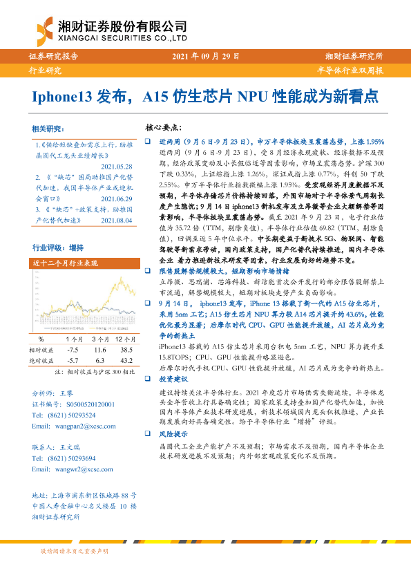 【湘财证券】【20210929】20210929-湘财证券-半导体行业双周报:Iphone13发布,A15仿生芯片NPU性能成为新看点-11页