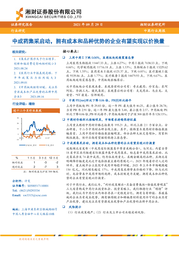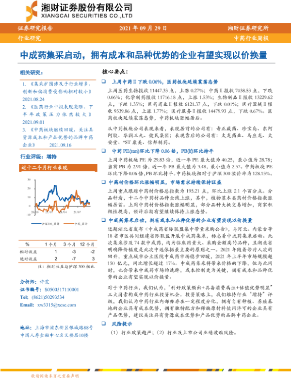 【湘财证券】【20210929】20210929-湘财证券-中药行业周报:中成药集采启动,拥有成本和品种优势的企业有望实现以价换量-11页