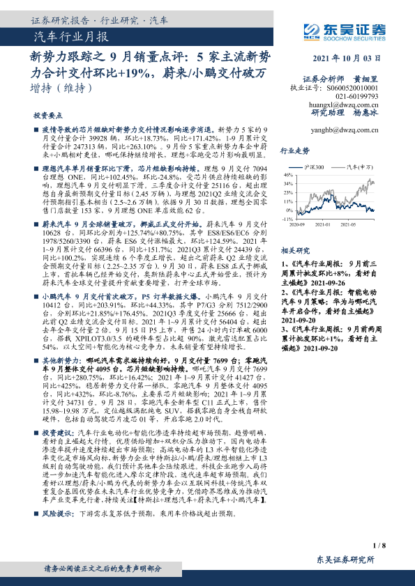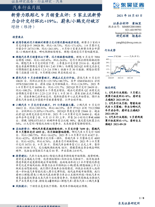 【东吴证券】【20211003】20211003-东吴证券-汽车行业月报:新势力跟踪之9月销量点评:5家主流新势力合计交付环比+19%,蔚来 小鹏交付破万-8页