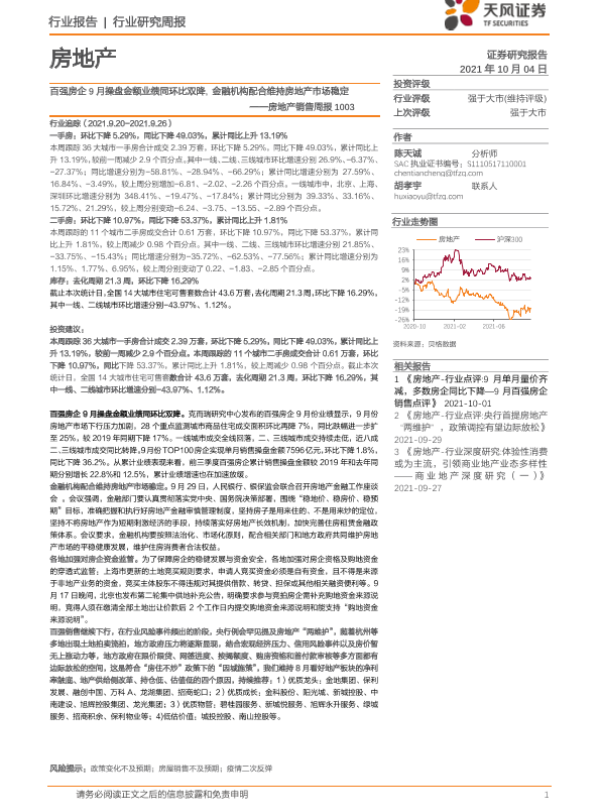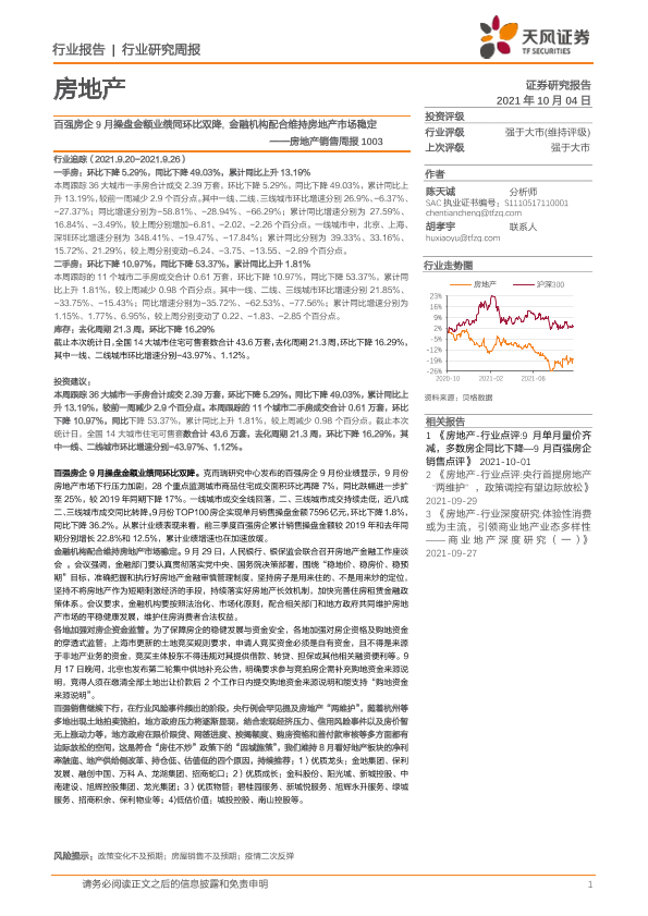 【天风证券】【20211004】20211004-天风证券-房地产销售周报:百强房企9月操盘金额业绩同环比双降,金融机构配合维持房地产市场稳定-15页