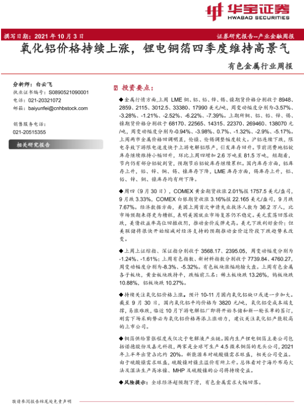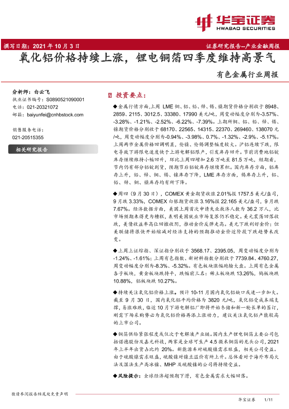 【华宝证券】【20211003】20211003-华宝证券-有色金属行业周报:氧化铝价格持续上涨,锂电铜箔四季度维持高景气-11页