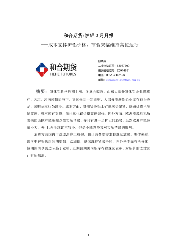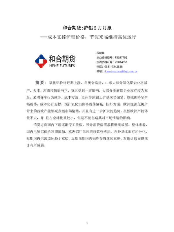 【和合期货】【20220207】和合期货 沪铝 2月月报---成本支撑沪铝价格,节假来临维持高位运行-16页