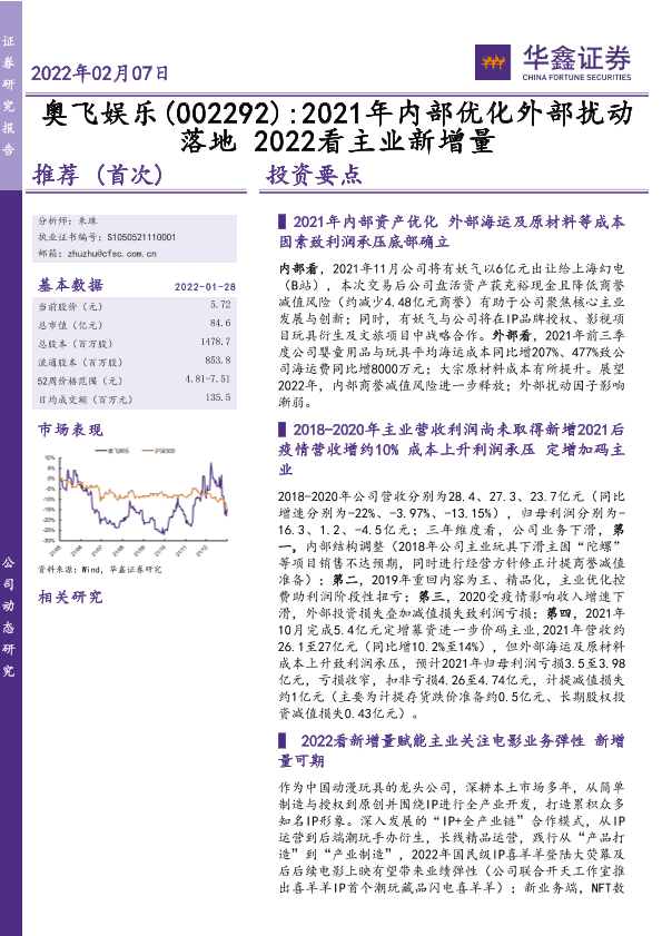 【华鑫证券】【20220207】奥飞娱乐 2021年内部优化外部扰动落地 2022看主业新增量-5页