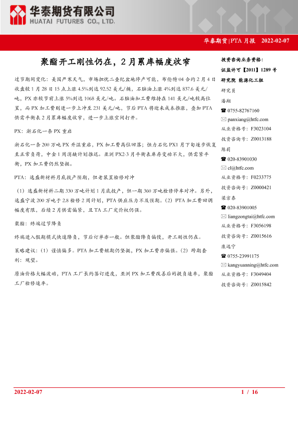 【华泰期货】【20220207】PTA月报_聚酯开工刚性仍在_2月累库幅度收窄-16页