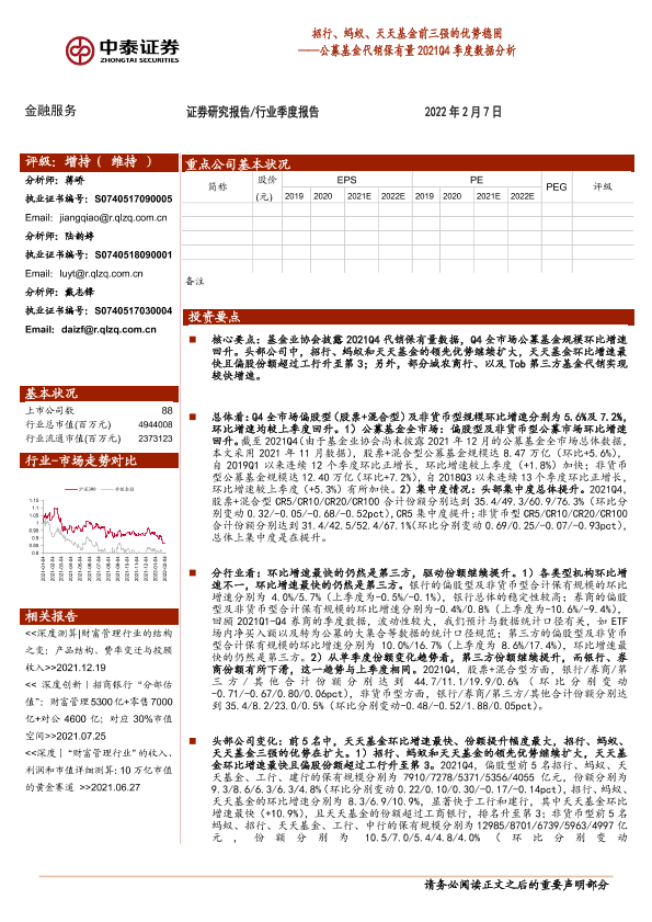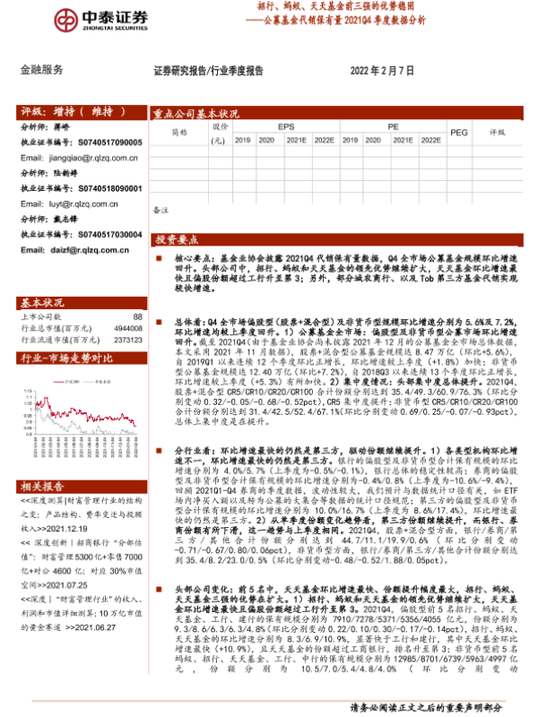 【中泰证券】【20220207】公募基金代销保有量2021Q4季度数据分析——招行_蚂蚁_天天基金前三强的优势稳固-10页